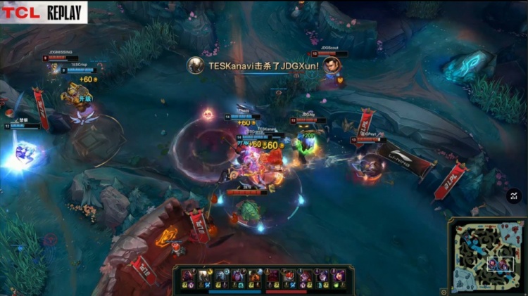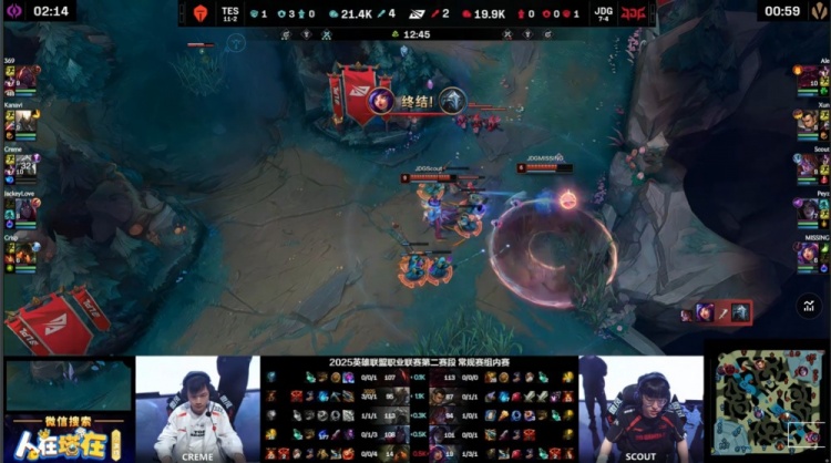 【19:42】JDG再开小龙,TES占住河道位置,正面Missing妮蔻没闪开TES两人,Scout进场双杀到手,ALe奥恩叫羊撞飞Kanavi,JDG打出1换3吃掉小龙,双方经济持平。