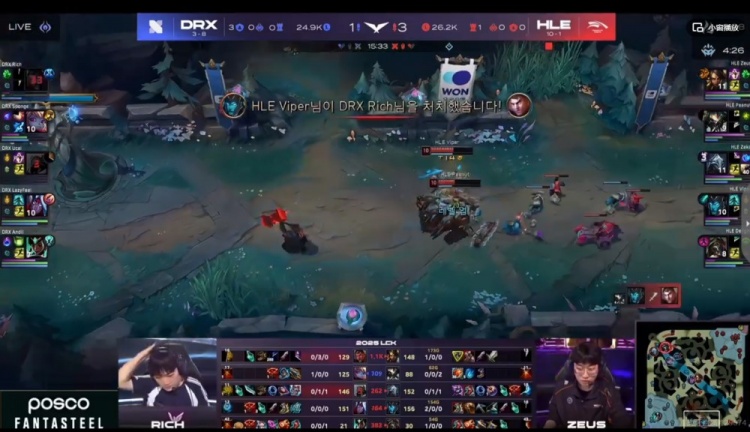 【40:40】大龙团ucal沙皇TP支援正面,但是自己只推回了Zeka维克托!没人管的Viper卡莉斯塔直接滑翔输出拉满,Lazyfeel维鲁斯尽力输出但是双拳难敌四手!被HLE三人围杀两条命全没了!回城防Zeus豹女的Rich杰斯再一次被单杀!HLE打出1换4,高地上再强杀Andil卡尔玛团灭DRX,结束比赛!
