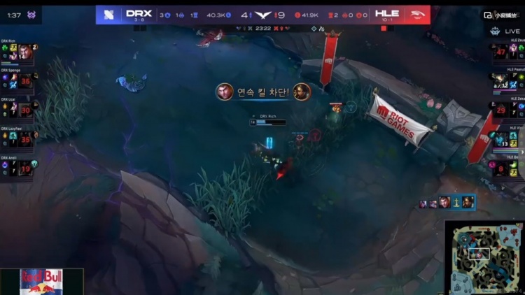 【35:35】DRX抱团拆掉HLE中路高地,随后是小龙团,Sponge波比大招锤空但是抢到了关键的小龙!不过残局自己跑不掉了!Zeus豹女追死杰斯,Viper卡莉斯塔回城赶到前后包夹,这波DRX抱团反向逃跑,结果被HLE打出1换5团灭!拆掉了对手的下路高地塔!