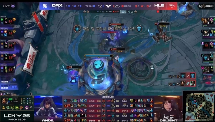 【18:05】DRX用先锋撞掉了HLE的中一塔,HLE则是拿下第二条小龙!本局土龙魂!随后做视野的Andil卡尔玛在HLE上半野区被抓死!