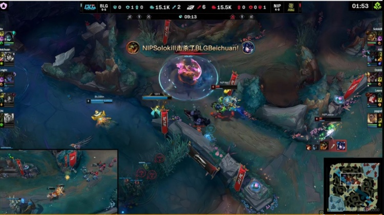 【14:00】Beichuan猪妹gank上路先配合约里克击杀掉了鳄鱼,NIP想动下路但是AKi大树先白给,NIP双C只换了一个还被knight塞拉斯丝血操作了!这波BLG支援反打,相当于又打了NIP一波1换4!