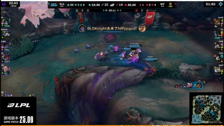 【23:40】野区BLG先手秒掉了ppgod芮尔,Leave女枪大招AOE拉满但是自己还是被丝血的knight塞拉斯硬切死了!这波knight塞拉斯双杀,SoloKill鳄鱼切后排吃了Elk霞倒钩白给!BLG再打一波1换3!
