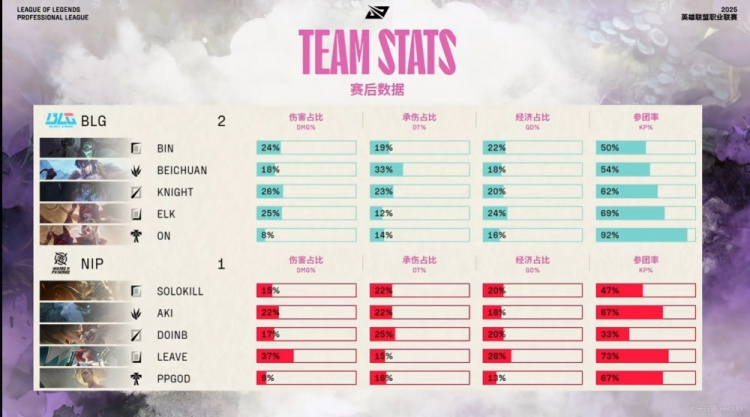 开局knight塞拉斯先动手抗塔被Doinb克烈反杀送出一血!但是BLG上下两路对线优势还是有经济领先!但是NIP在河道团再次打出1换3,关键的中路团战SoloKill鳄鱼进场切后排,NIP打出2换3还想越塔结果被BLG上辅操作了!这波Bin约里克三杀,BLG相当于打了NIP一波团灭拉开经济差!随后SoloKill鳄鱼连续被抓,下路团AKi大树还白给,BLG再打一波1换4之后没了悬念!最终大龙团knight塞拉斯收割结束比赛,BLG击败NIP拿下六连胜!