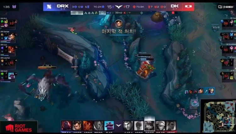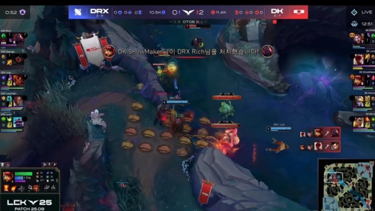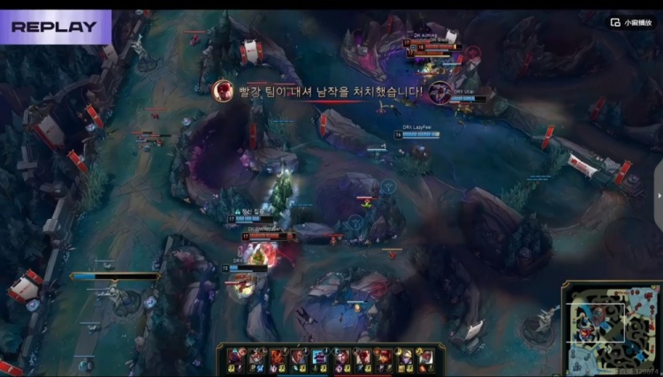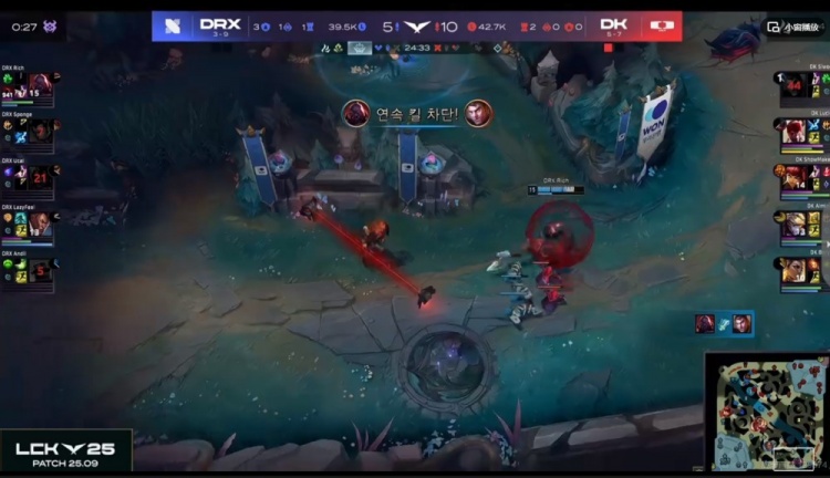 【24:05】野区Sponge赵信先手自己带队白给,DK支援到位多打少直接打了个0换3!但是下路的Rich塞恩单杀掉了没闪的Siwoo杰斯!