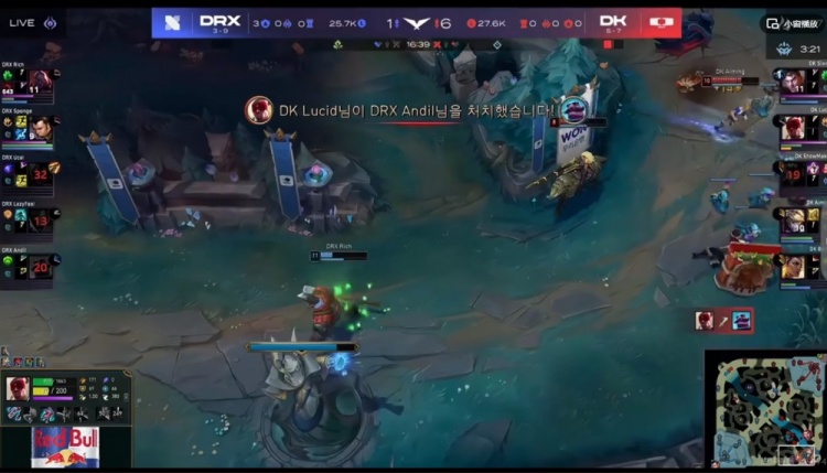 【16:02】小龙团,BeryL芮尔吸两个配合SMK安妮砸大秒掉了抢到龙的GIDEON赵信,残局Lazyfeel卢锡安龙坑扫大被Siwoo杰斯打断,侧翼ucal岩雀击杀掉了SMK安妮,Luicd盲僧带队追击,这波DK打出1换4!