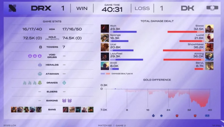 第二局比赛Lucid选出招牌盲僧节奏不断,DK前期拿下优势但是中期被DRX一波多打少秒了双C拿下先锋!随后DRX拿下听牌龙给压力,但是DK抱团rush大龙成功!随后的比赛DRX拿下风龙魂但是DK打出0换3之后先推一路高地!随后又在野区秒掉了落单的Sponge赵信再拿一条大龙!决胜的远古龙团DK中辅先手秒赵信但是被Sponge开出了大招!Andil布隆大招击飞两个配合队友反打,正面的Rich塞恩给足压力,Lazyfeel卢锡安没人管了收割了战场!DK在多两个复活甲的情况下被DRX团灭,DRX顺势一波扳平了比分!