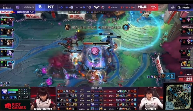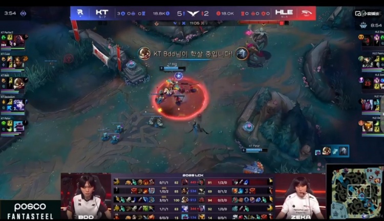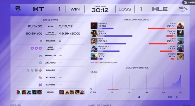 第二局HLE前期Zeus杰斯上路来就有,而Cuzz豹女在刷野和节奏上都是压制住了Peanut斯卡纳!KT先拿小龙给到压力,中期先是小龙团Zeus杰斯在维克托不在的情况下离谱单人绕后白给,随后KT抱团拿下荆棘厄塔汗,Deokdam艾希一箭命中Peanut斯卡纳将他拿下,KT顺势大龙逼团,Viper维鲁斯又离谱出现在了对手野区位置被追死,这波KT大胜之后拿下大龙,随后又中路再秒斯卡纳之后拿下远古龙,知道对手拿远古龙的Zeka维克托还在下路带线,结果直接被抓!KT抱团顺势一波结束比赛,扳平了比分!