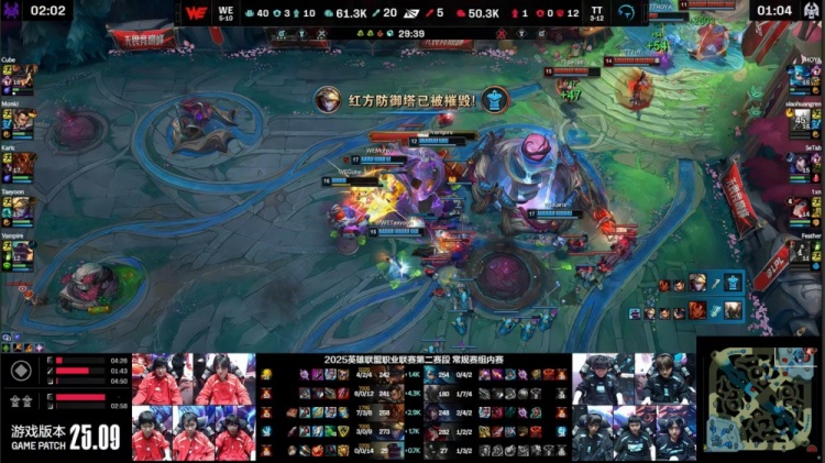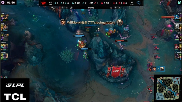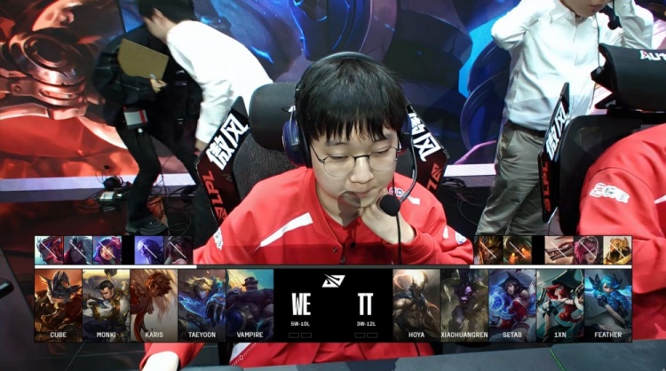 后期23分钟下路团战Cube兰博三杀奠定胜势,尽管大龙被小黄人抢下,WE仍然稳步推进。最终在28分钟上路推进中,Monki赵信击杀Feather牛头,Karis岩雀带走小黄人,WE一举摧毁TT基地,赢下首局。