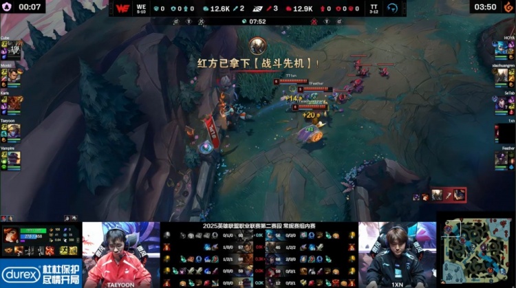 中期WE在先锋团战中打出1换5,Cube兰博与Taeyoon伊泽瑞尔稳定输出,配合Monki完成收割,经济差距迅速扩大至5k。