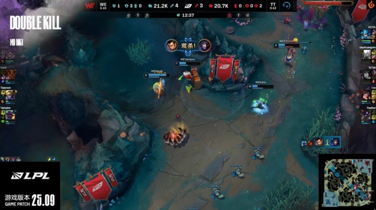 【12:25】小龙团,三角草小黄人潘森1v3被Monki赵信带走,随后Monki调转枪头捅飞SeTab狐狸拿到双杀,WE打出0换2,吃掉两条小龙,双方经济差距不大。