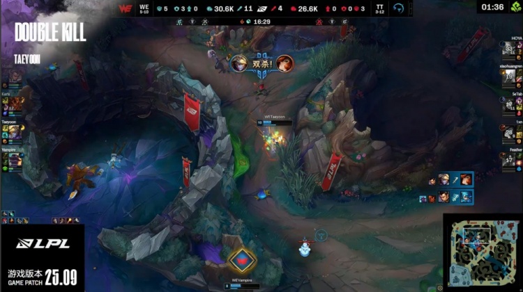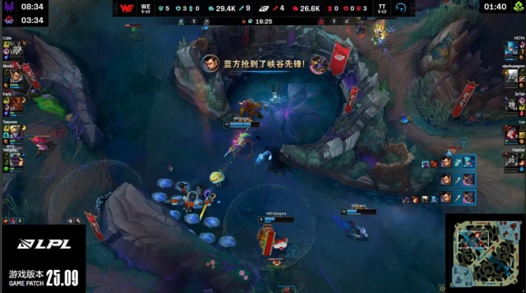 【25:38】WE果断开大龙,小黄人抢掉大龙但自己被杀,WE打出0换1推掉TT中路水晶后撤退,WE经济领先7k。