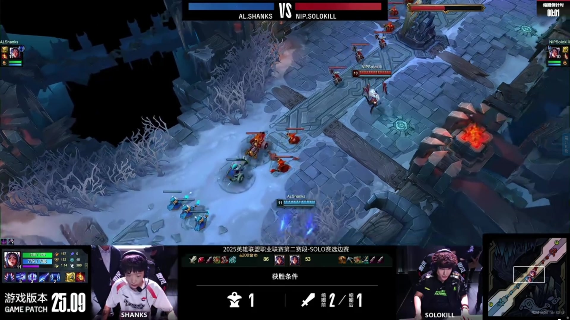 Shanks操作手法全程压制,补刀大幅度领先+压制2级;缩圈前轻松双杀拿下选边权;AL首局选蓝。