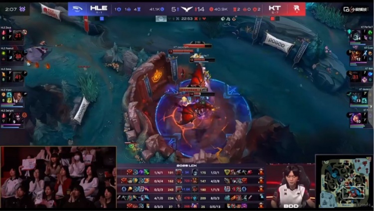 KT前期拿下小龙给到压力,22分钟下路三人蹲草逮捕Zeus安蓓萨之后拿下火龙魂!但是随后一波中路团战自己阵型被拉扯,HLE双C成功收割,打出0换5的HLE想一波但是Zeka沙皇吃到妮蔻E白给,复活的Bdd安妮砸大秒了两个!KT团灭HLE没让自己水晶爆炸!
