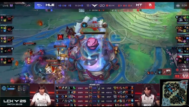 【22:50】Zeus安蓓萨下路又被KT三人蹲草逮捕!随后火龙团Bdd安妮闪现砸大两个,虽然HLE双C输出换掉了安妮,但是正面进场的Zeka沙皇开推之后自己也活不下来!KT打出1换3,拿下火龙魂!