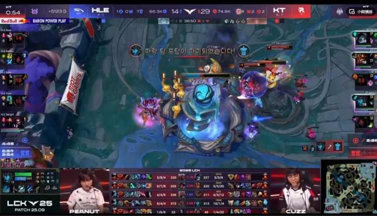 【26:00】中路团战,Zeus安蓓萨被狂反手进场白给!但是正面的Viper卢锡安+Zeka沙皇进场分割了战局,KT各自为战让Viper卢锡安输出拉满!这波HLE打出1换5,从中路想一波!但是Zeka沙皇被Peter妮蔻击杀,Bdd安妮及时复活砸大秒了两个!仅剩的Zeus安蓓萨和Viper卢锡安拆不掉水晶!这波KT反手团灭HLE拿下大龙!