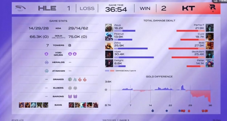 随后的比赛有卡莉斯塔拔矛惩的KT连续拿下大龙+远古龙!Peanut猪妹抢远古龙失败之后HLE没了机会!KT一波2换5团灭对手,结束比赛让一追二完成翻盘,同时还终结了HLE的大场十一连胜!