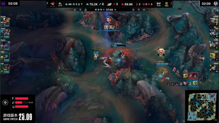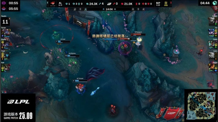 【25:23】AL去开大龙,NIP过来接团,Aki抢龙失败,AL吃掉大龙,经济领先8k。