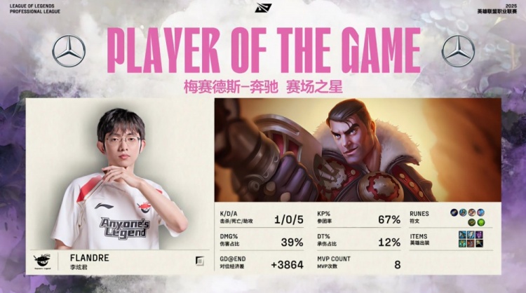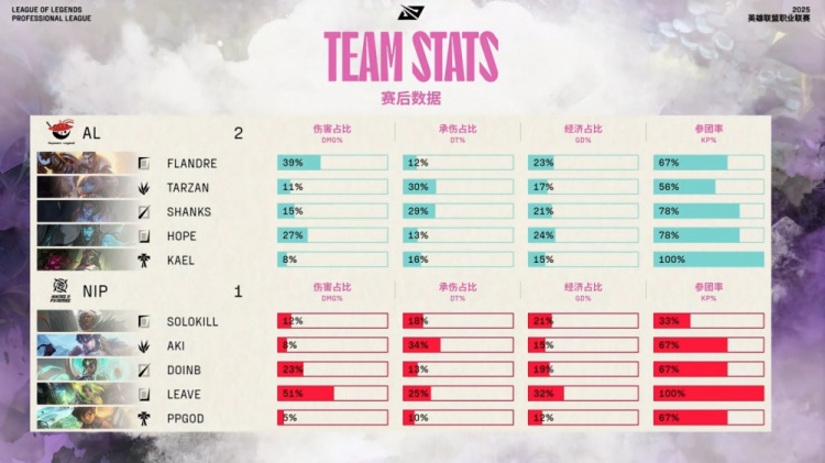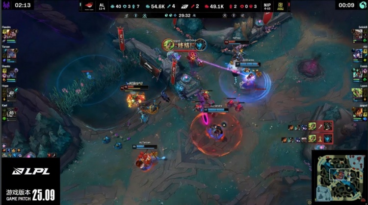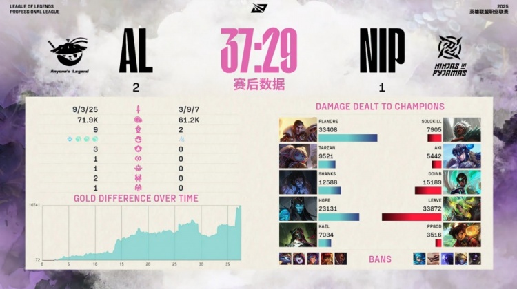 后期AL连续拿下大龙与水龙魂,Leave泽丽放电双杀不解渴,Flandre杰斯团战中持续poke压NIP众人血线,Hope输出稳定,最终在36分钟老龙团中由Flandre侧翼轰残NIP三人,Hope正面爆发收双杀,AL打出1换4后一波结束比赛,拿下本场胜利。