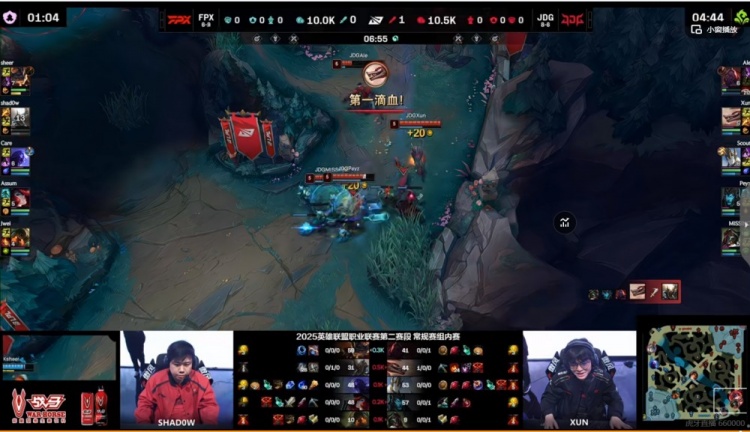 【6:55】JDG拿下第一条小龙之后直接四人抱团包下,本来是想找机会的shad0w潘森反而成为了被抓的那个!Xun纳亚菲利拿下一血!