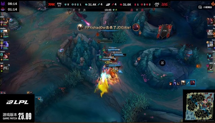 【8:25】shad0w潘森大招抓下,配合sheer兰博追死了没闪没大的Ale塞恩,JDG则是换掉了三条巢虫!