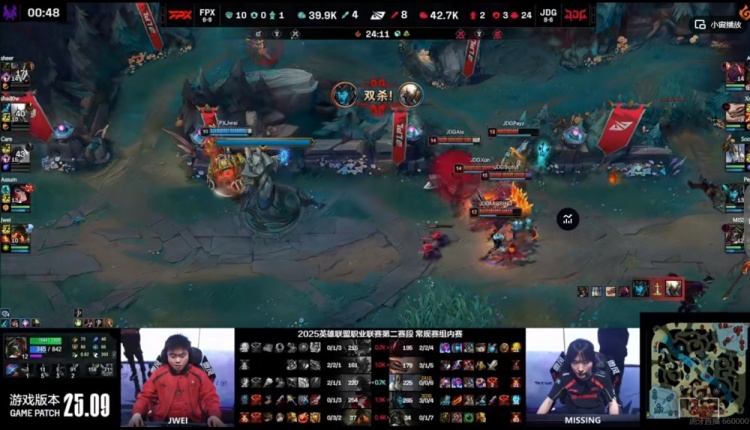 【24:00】JDG下路越塔强杀sheer兰博,回头FPX还想反打,结果shad0w潘森和Care瑞兹追击落地直接吃了个贴脸的恶意收购全白给了!JDG追击再秒Assum女枪打出0换4,拆掉对手下路二塔+拿下听牌龙!经济差4K了!