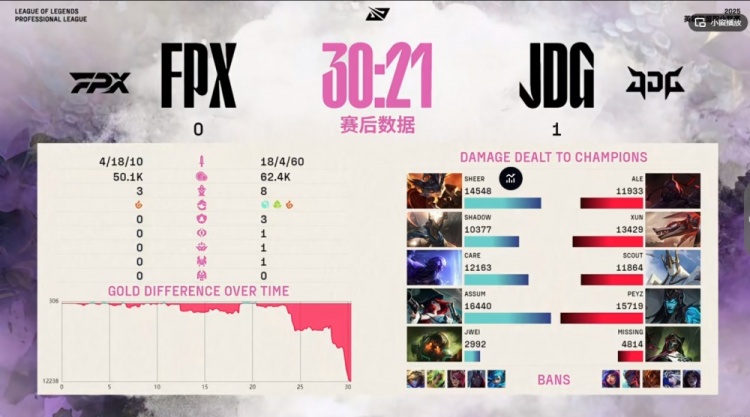第一局JDG前期运营+换线没让FPX找到什么机会,第二条小龙团Scout加里奥给到保护,JDG一波0换2之后拿下小龙给到FPX压力!虽然FPX抓到一波机会还了JDG一个0换3,但是全场这就这一次机会了!随后JDG下路强杀sheer兰博,FPX想救队友结果直接葫芦娃救爷爷被抱团的JDG再打一波0换4!JDG大龙逼团秒了瑞兹之后留人成功,第二次打出0换4之后奠定了胜局!最后的中路团JDG先手秒人成功,MISSING烈娜塔连续给出好大,JDG团灭FPX赢下首局!