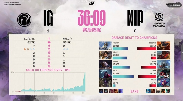 首局比赛iG选出TheShy加里奥上单对位SoloKill兰博不落下风,Jiejie赵信gank下路拿下一血,拿下小龙给到NIP压力,但是中期NIP运营拉住经济,几波团战连续都不亏,甚至iG在多个人的情况下Meiko牛头白给,还把荆棘厄塔汗送给了NIP!比赛进入30分钟,NIP视野不好主动放掉风龙魂,但是随即的河道团,ppgod妮蔻先手闪现开到Rookie发条被他金身秀了,ppgod可以走还不走想硬压起身,但是iG的队友们都在啊!TP支援的Doinb维克托落地被抓,iG正面团大胜,直接一波结束首局比赛!