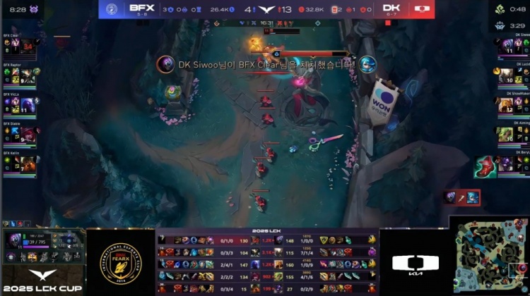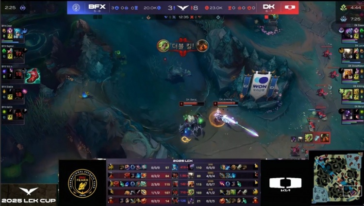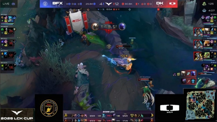 【25:43】BFX上路四抓一Siwoo失败,中路许哥与BeryL推掉BFX高地塔,Raptor蝎子上路被抓,拉DK三人毫无伤害被反杀,DK回头吃掉大龙,经济领先1w3k。