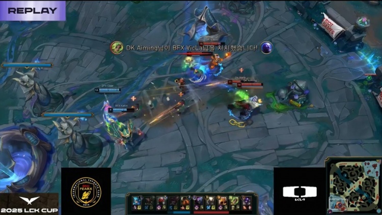 第二局前期BFX尝试通过小龙团建立优势,VicLa瑞兹与Kellin泰坦率先发难带走Aiming泽丽与BeryL牛头,但残局处理失误被Lucid潘森与许哥沙皇接连反打,DK小劣开局稳住局势。