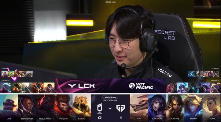 第二局前期GEN通过视野压制逐步掌握主动,Pyosik猴子在6分钟小龙处遭到GEN多人包夹,未能控下资源。随后下路对抗失势,Berserker卢锡安与Life布隆在2v2中被Ruler伊泽瑞尔与Duro芮尔强开击杀,Pyosik支援下路又遭中野联动抓死,GEN迅速建立3k经济优势。