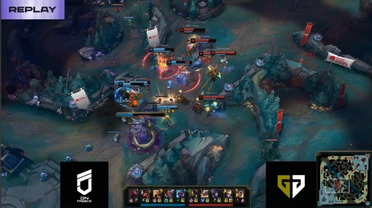 【23:09】GEN中路推进,Ruler大招刮死DNF两人,Canyon冥犬进场也拿双杀,GEN打出0换5团灭DNF,中路一波推平DNF基地拿到比赛胜利。