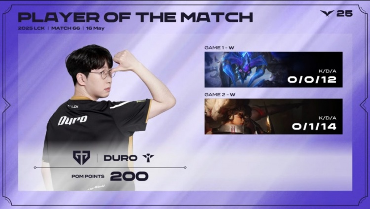 中期DuDu赛恩被多次越塔击杀,Life布隆做视野时再被击杀,BuLLDoG沙皇推空气,GEN不断扩大资源差距。后期Duro芮尔与Chovy狐狸完美配合在下路开团,Ruler伊泽瑞尔进场收割打出关键团灭,GEN顺势拿龙。最终GEN再度完成0换5团灭,一波结束比赛,成功2-0带走本场BO3胜利。