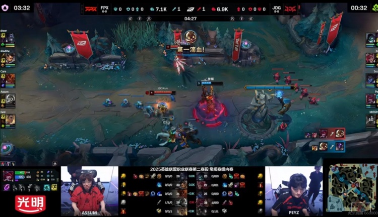 【4:27】JDG三人包下,FPX下路组强行操作让Assum库奇击杀掉了MISSING牛头拿下一血!但是库奇还是被Peyz霞换掉!1换1!