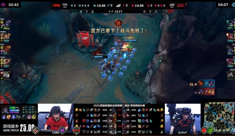 【20:10】河道FPX抓死迷路的MISSING牛头,结果Care岩雀大招想守中一塔被JDG三人强开越塔击杀!大招支援的sheer慎也没保住队友!同时上路JDG三人想动手结果偷到慎大招的Scout塞拉斯支援反打,Ale约里克反击拿下双杀!这波JDG打出1换3,顺势拿下荆棘厄塔汗!