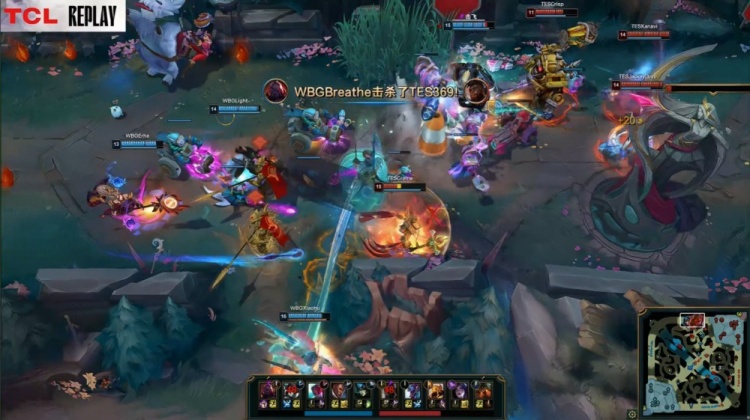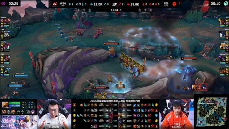 【14:52】xiaohu上路塔下被TES中辅两人越塔击杀,xiaohu交闪难逃一死,Creme再拿一个人头。随后小天上路三角草冲脸Creme将其撞飞单杀+350金币,WBG经济领先2k。