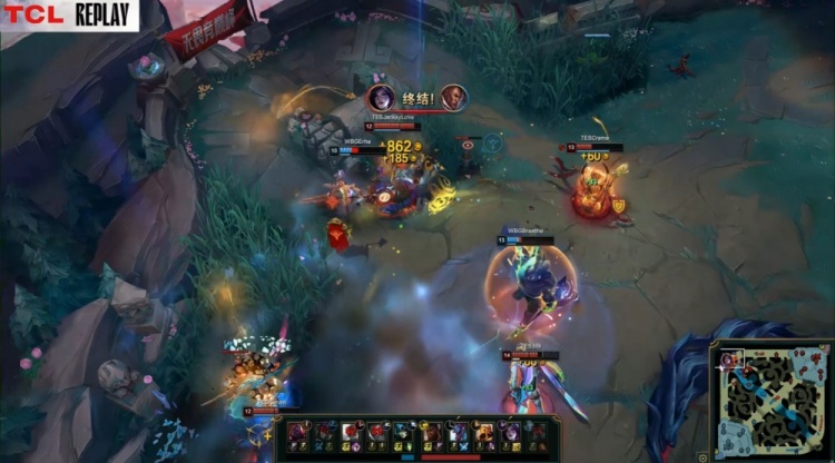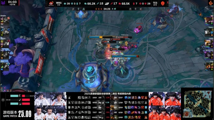 中期WBG连续发力,小天单杀Creme沙皇后,WBG下路四包二得手再控小龙,将领先扩大至4k。然而20分钟TES在河道团战中由Crisp泰坦开团,Creme沙皇与JackeyLove卡莎配合打出1换5,TES实现关键翻盘。