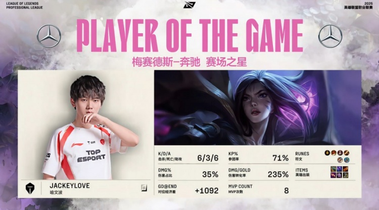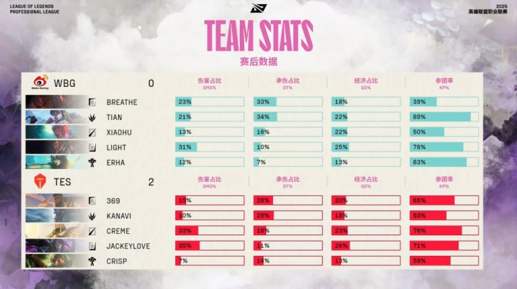 后期WBG再次掌握节奏拿下大龙并推掉TES上路水晶,但后续Kanavi抢掉大龙打断WBG节奏。关键团战,TES抓住Light卢锡安滑脸失误由哥哥卡莎收割残局,TES一波推平WBG基地拿到比赛胜利。