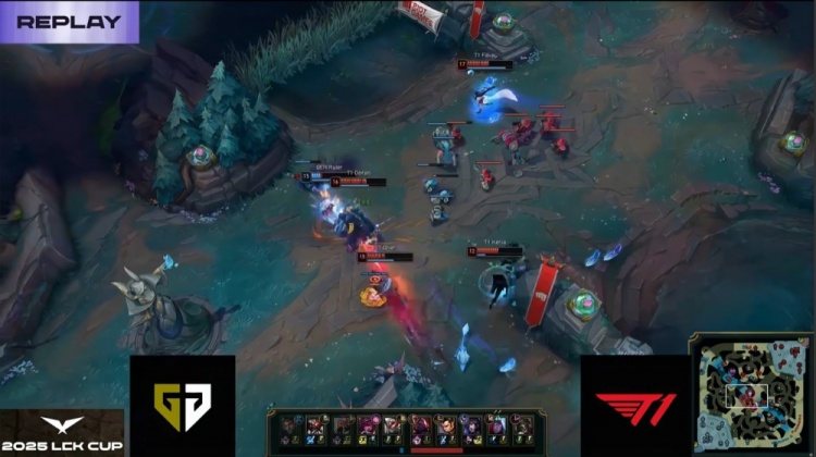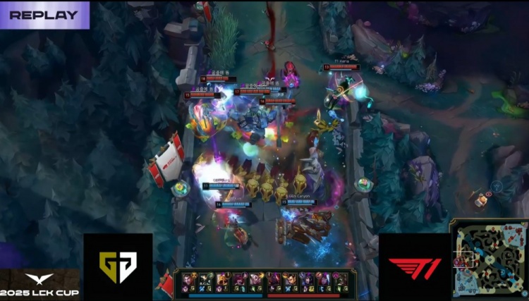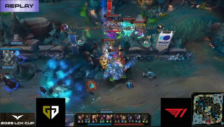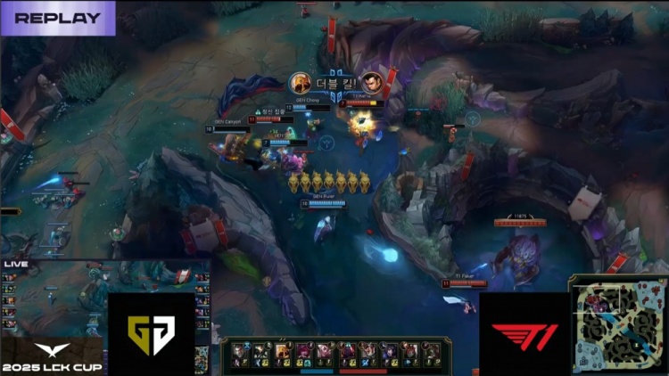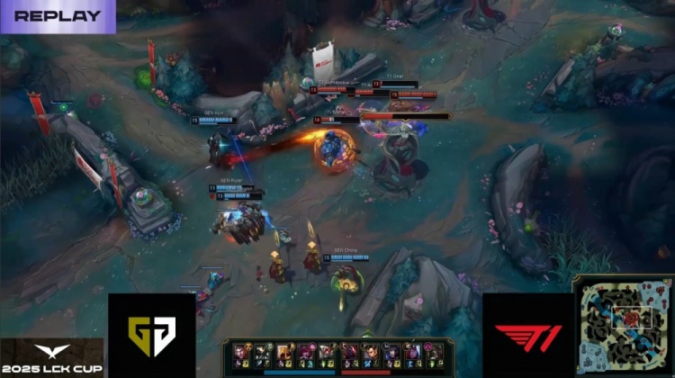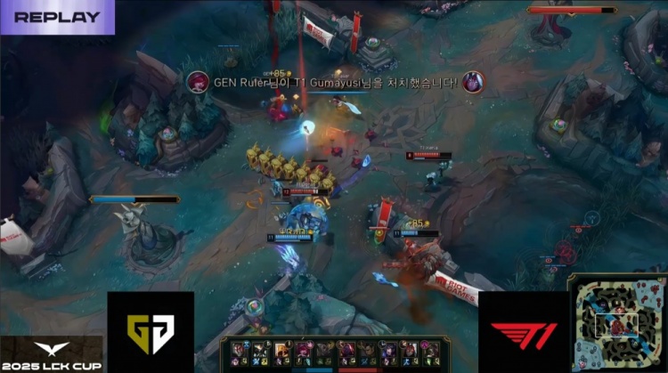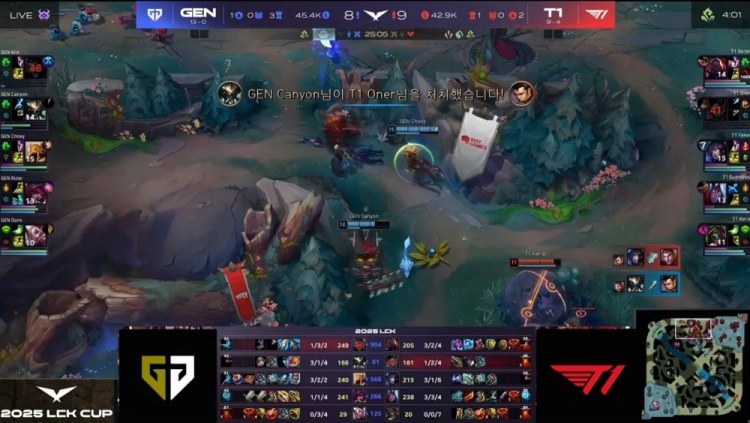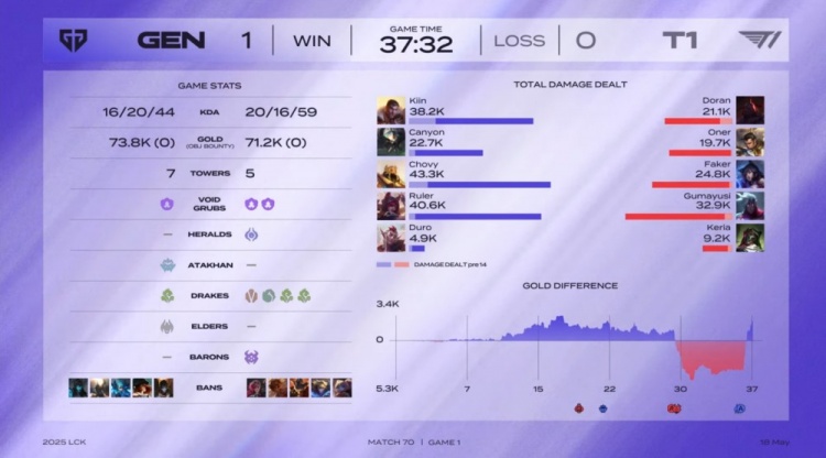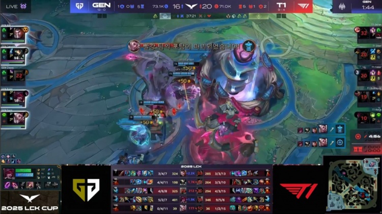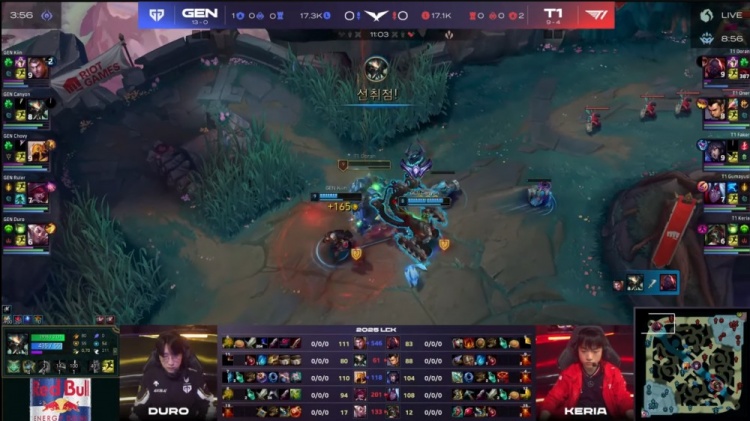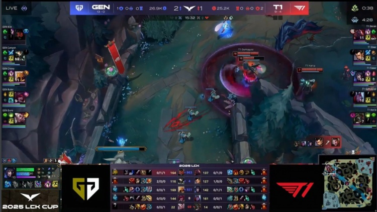 第一局GEN前期围绕上路打开突破口,Canyon蝎子绕后配合Kiin杰斯击杀Doran赛恩,建立小幅经济优势。虽然Oner赵信控下两条小龙,但Faker狐狸下路遭GEN三人集火击杀,T1节奏受阻。