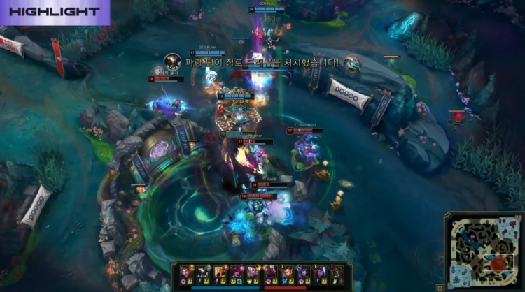 后期GEN迅速调整,老龙团Canyon蝎子抢龙成功一锤定音,Chovy完美推中T1后排,GEN融化T1打出0换5完成团灭,一波推平基地先下一城。