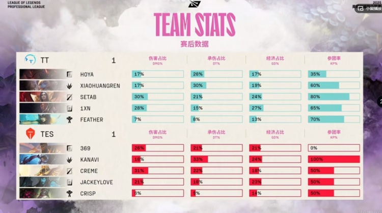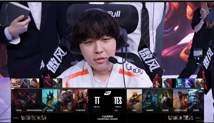 TES:上单369、打野Kanavi、中单Creme、下路JackeyLove、辅助Crisp