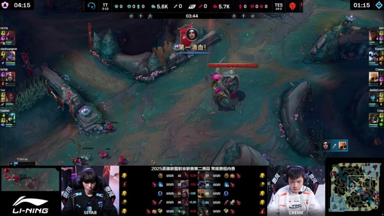 TT:上单HOYA、打野xiaohuangren、中单SeTab、下路1xn、辅助Feather