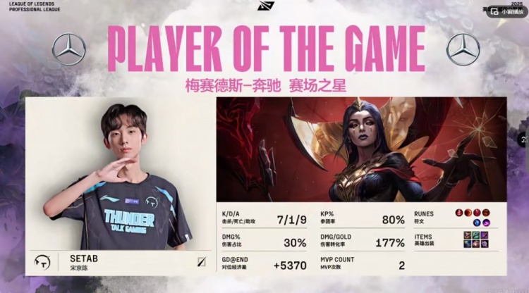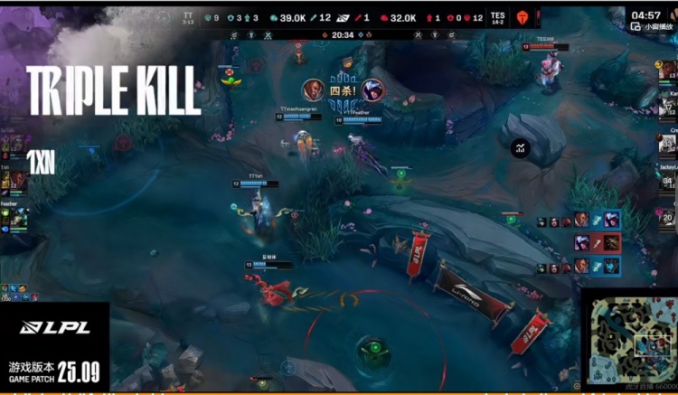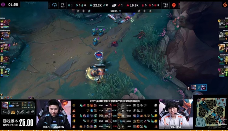 【25:33】野区Kanavi泰隆单杀掉了SeTan乐芙兰!一千块赏金到手!Kanavi泰隆单人去拿小龙,TT直接大龙逼团,正面TES还想看结果被TT直接强开!双C倒下之后TES也守不住了!TT打出1换3,直接一波结束第二局比赛!