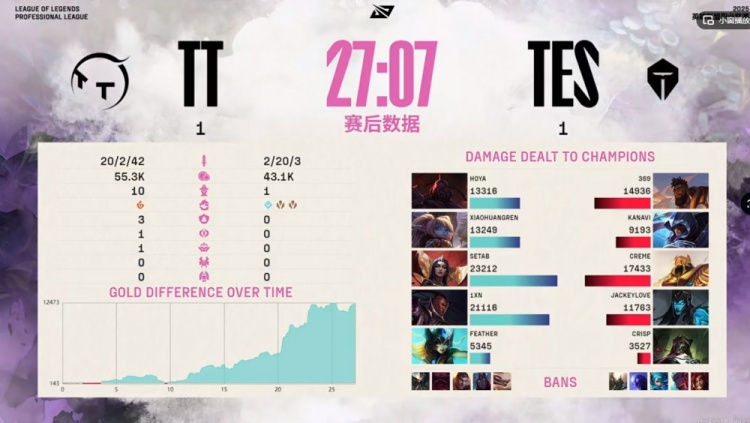 第二局开局SeTab乐芙兰中路对位单杀Creme沙皇拿下一血,随后xiaohuangren波比给到保护+节奏,SeTab乐芙兰在中下两次小团中连续拿到击杀!TES有点管不住了!中期1xn卢锡安大招打满伤害,Kanavi泰隆也白给被抓,小龙团HOYA塞恩泥头车毁灭TES阵型,侧翼的Creme沙皇切入直接被xiaohuangren波比一个坚定风采逮捕!1xn卢锡安这波再砍四杀!TT团灭TES,紧接着下路团战再胜,拆掉下路高地之后领先一万二的经济了!虽然Kanavi泰隆野区单杀乐芙兰拿下1000块,但是TT大龙逼团强开,再次打出0换3之后一波结束了比赛!碾了TES扳平了比分!