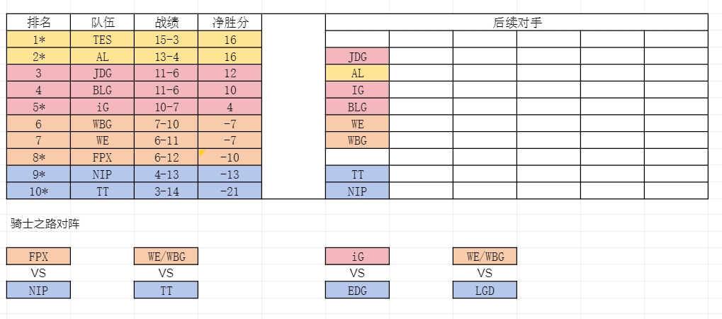 而骑士之路的对阵也快揭晓,WBG和WE后续将迎来一场交手,胜者锁定第六,交手涅槃第一LGD,败者交手TT。