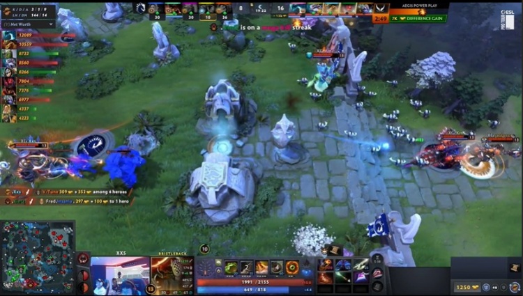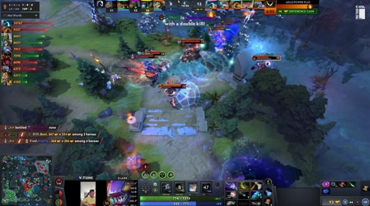 【19分钟】XG下路推进,Ame水人变暗影萨满给控制,xxs钢背兽冲脸,一直冲上高地击杀Insania光法,V-Tune小鱼人被控住击杀,Liquid被打一波四人阵亡,XG经济领先17K。