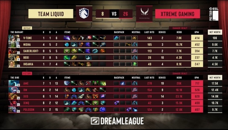 【23分钟】Liquid扑出来团战被打一波四人阵亡,XG中路直接基地,Liquid打出GG。