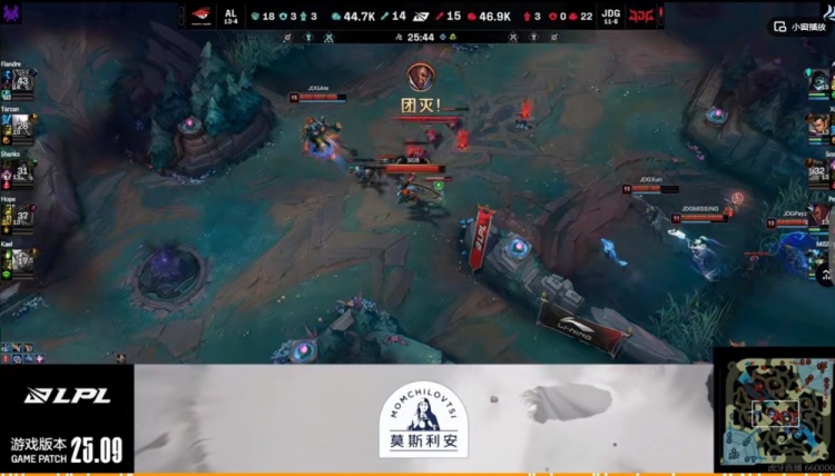 【25:30】小龙团,Peyz卢锡安poke伤害给足压力,Tarzan潘森大招进场被MISSING娜美水泡压起身击杀!残局Shanks阿卡丽进场又和Scout安妮一换一,但是没人管的Peyz卢锡安配合Ale约里克三杀收割!JDG打出1换5团灭AL,直接拿下大龙!AL只能换掉小龙!
