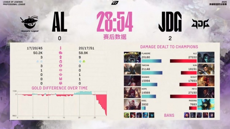第二局JDG下路组对线打出优势,但是进攻太急反而被AL打出1换3!但是中期Ale约里克单带给足压力,发育不够好的Flandre内瑟斯只能被动防守!不过AL也是团战找到机会,连续两次秒掉了Peyz卢锡安顶住了局势!关键的厄塔汗团战Xun赵信先手逼出Hope霞技能,正面AL中上冲锋但是只打了个中单互换!Ale约里克+Peyz卢锡安打扫战局,JDG在厄塔汗团+小龙团两次大胜之后拿下大龙拉开经济差!最终的高地团还是约里克3杀+卢锡安2杀成功收割,JDG横扫AL,以大场五连胜+小局十连胜的成绩结束了组内赛!