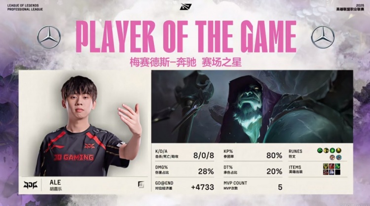 第一局:🎮Peyz伊泽瑞尔稳健兜底 Ale兰博一反常态几乎不送 JDG赢下首局