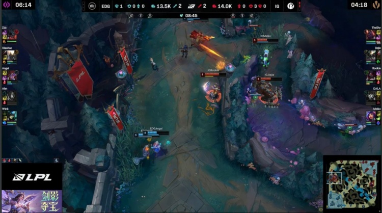 【13:49】iG去开小龙,jiejie与GALA拔矛惩失误,xiaohao潘森抢掉小龙,Meiko妮蔻进场没开出大招就被击杀,Angel再杀jiejie拿到双杀,EDG打出0换3推掉iG下路一塔,经济领先2k。